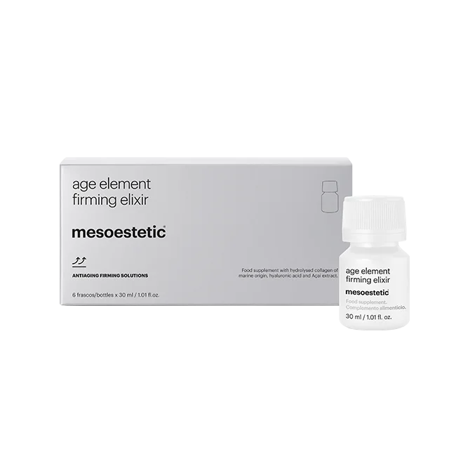 A drinkable nutritional supplement formulated with 10g of hydrolysed collagen, mesoestetic Age Element Firming Elixir also contains hyaluronic acid and active ingredients with antioxidant action.