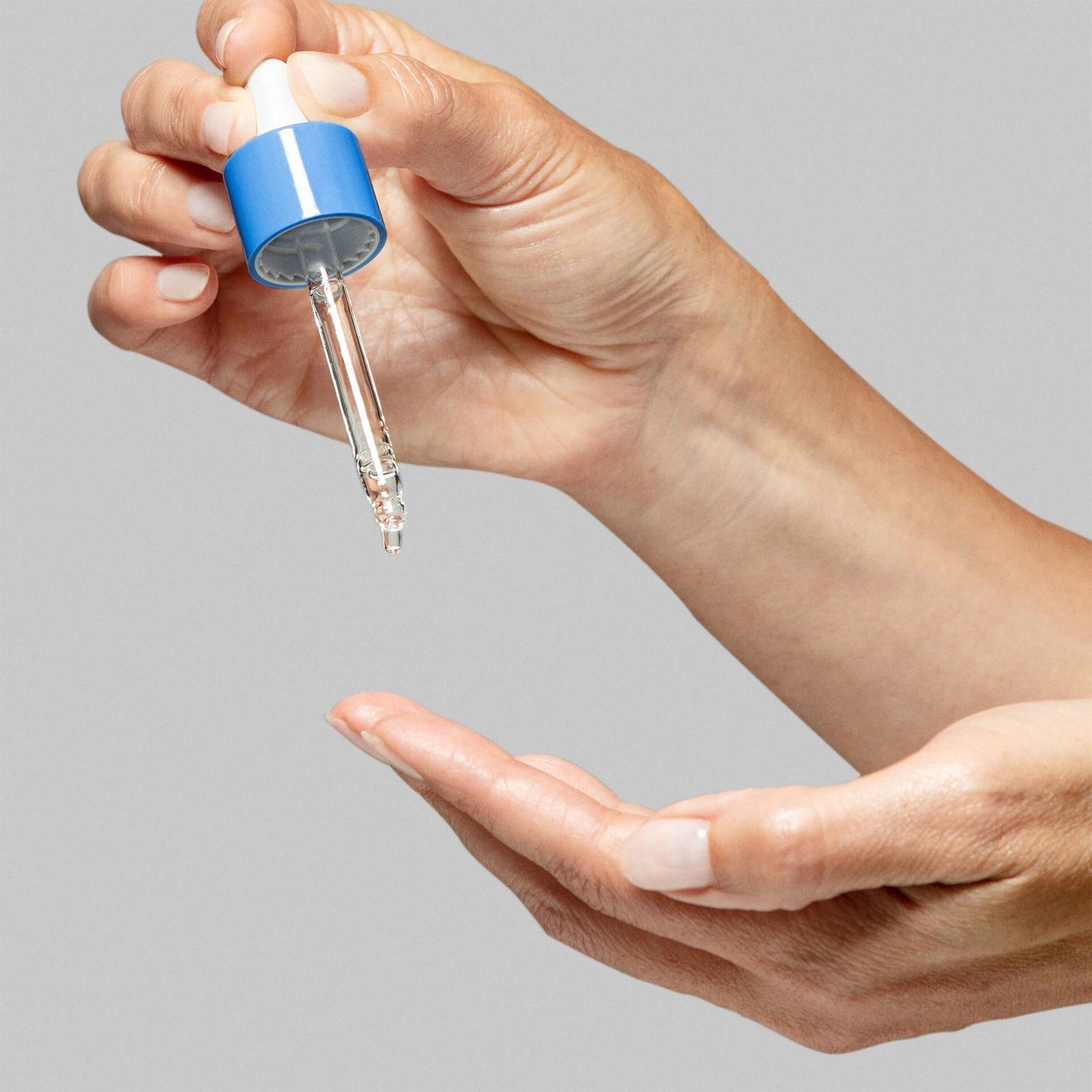 2. Dispense half a dropper of serum into the palm of your hand, press your palms together and press the serum onto your face and neck. Lightly spread the serum over the skin including around the eye orbit.