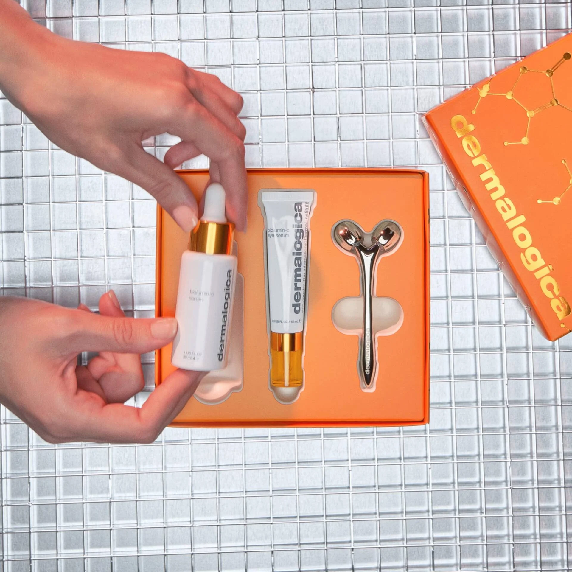 Includes: full retail sizes of Biolumin C Serum 30ml, Biolumin C Eye Serum 15ml, Skin Roller.
