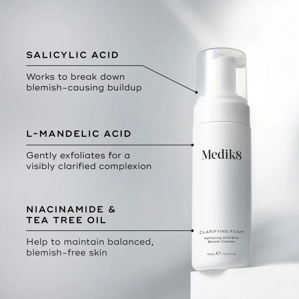 Perfect for blemish-prone skin Medik8 Clarifying Foam is a deeply purifying foaming cleanser, which unclogs pores and gently exfoliates the skin without causing dryness or irritation.