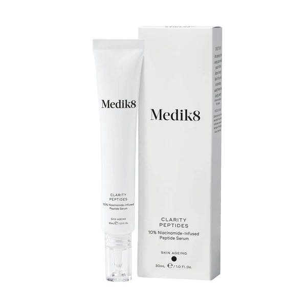 Anti-inflammatory hero, Niacinamide – also known as Vitamin B3, is formulated at a 10% concentration in Medik8 Clarity Peptides, helping to soothe and restore irritated, redness-prone and blemished complexions.