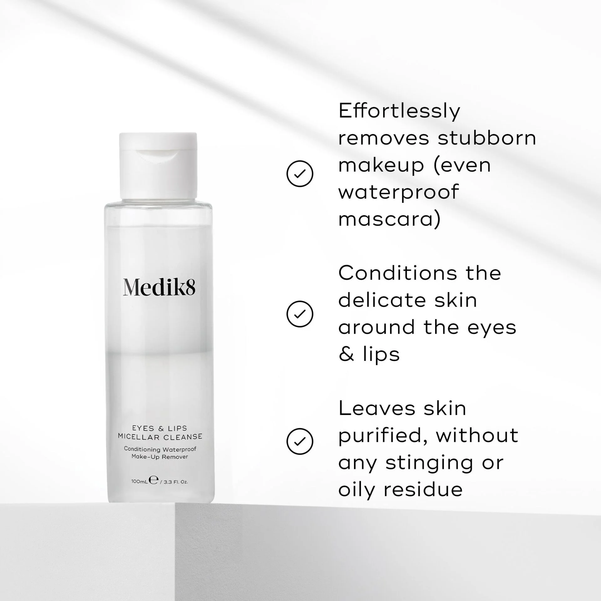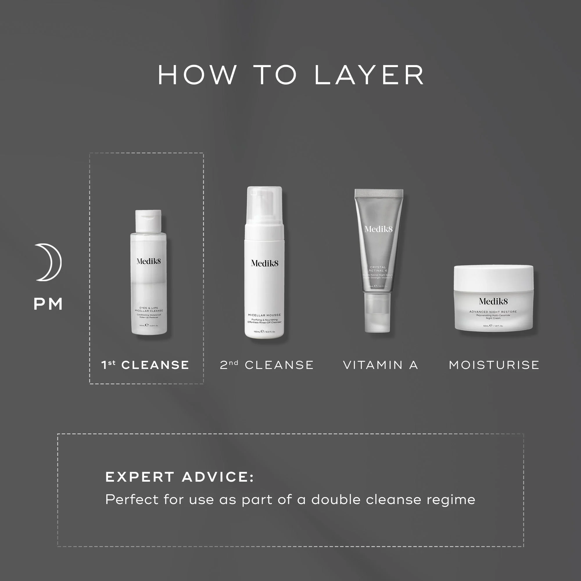 Leave nothing behind with Eyes & Lips Micellar Cleanse. A triple-phase micellar cleansing system that gently removes long-wear lip and eye make-up without the need to tug skin.