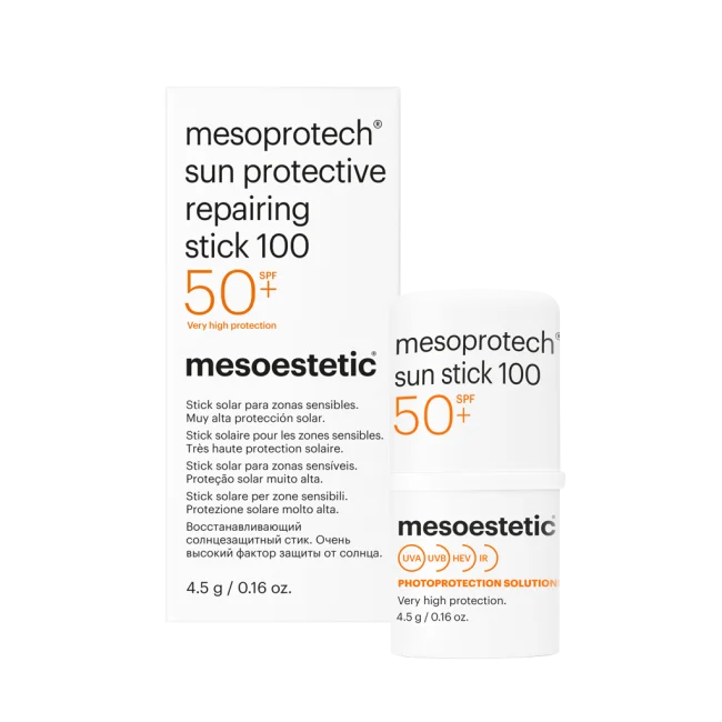 Featuring superior high sun protection and an innovative solid stick application, mesoestetic Mesoprotech Sun Protective Repairing Stick provides targeted defense against UVB and UVA radiation as well as visible light (HEV) and infrared radiation (IR).