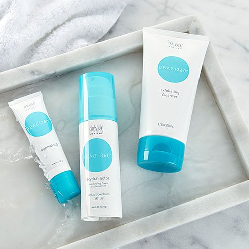 The OBAGI360® System Kit includes the OBAGI360® Exfoliating Cleanser, Obagi® Hydrafactor Broad Spectrum SPF 30 and the Obagi® Retinol 0.5. These three products work together in unison to fight the appearance of fine lines, wrinkles, pigmentation and breakouts, whilst rejuvenating the skin for a brighter, more radiant complexion.